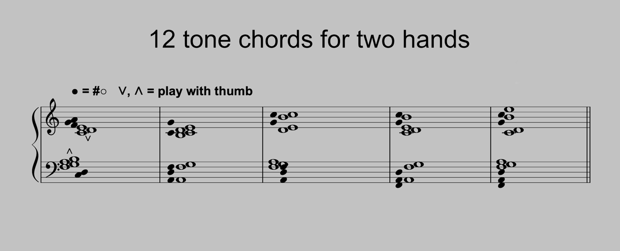 one thumb can simultaneously strike two keys on a keyboard. this allows to play chords containing all 12 notes with two hands. this website is a shared effort to create a growing collection of the various chords possible. please submit any chords you may find. if you wish, your name will be credited with your submission. contact |
